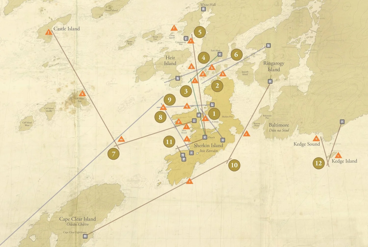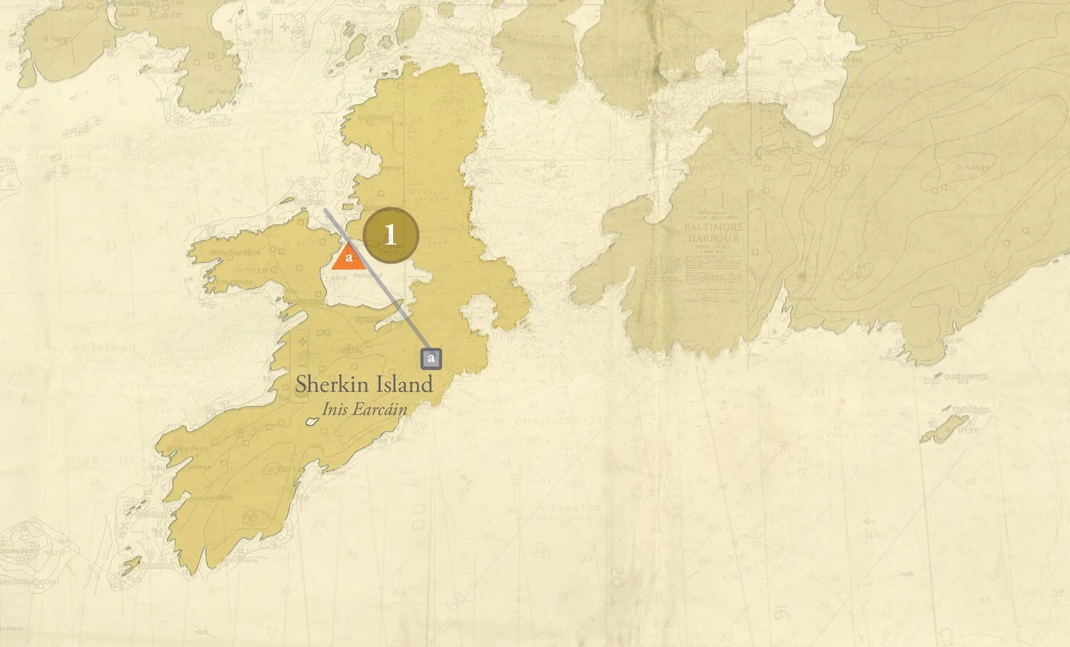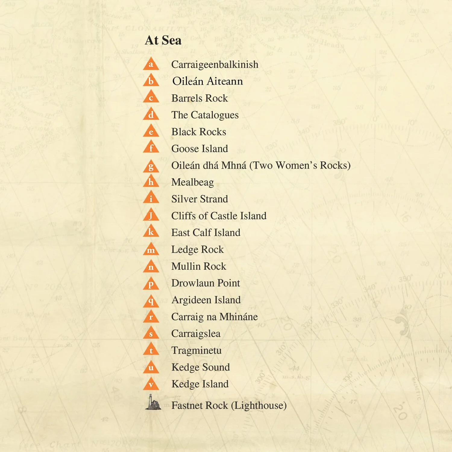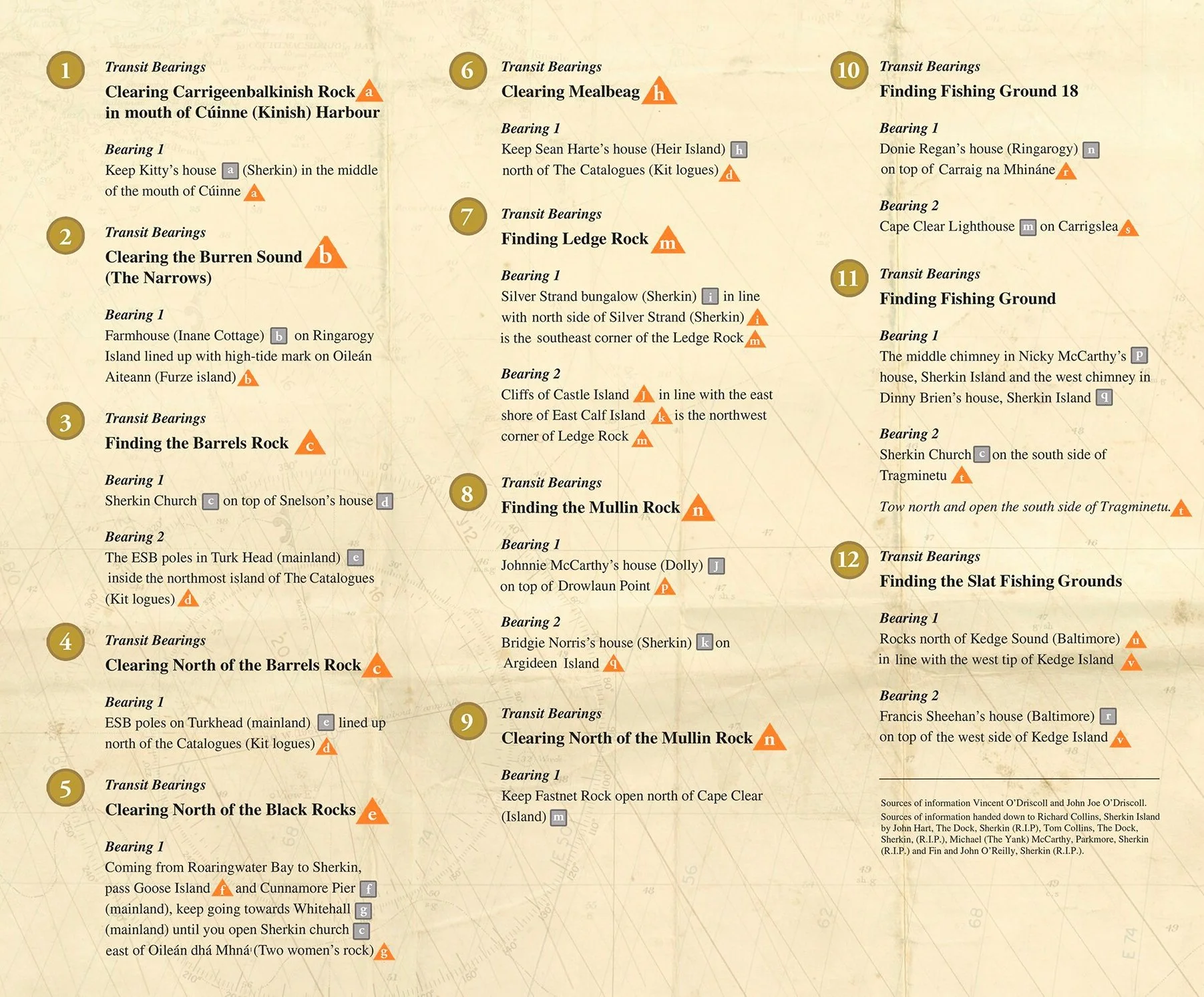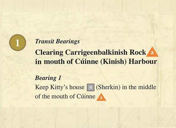 This visual bearing is used to clear the (often) hidden rock, Carrigeenbalkinish Rock, at the mouth of Cúinne, marked on the map as ‘a’ in an orange triangle.